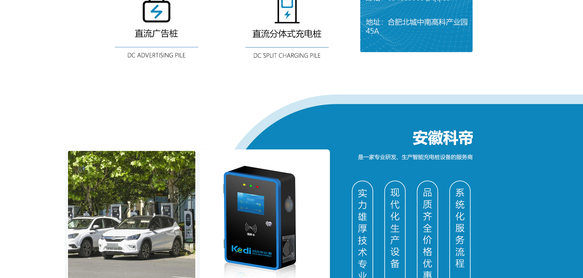 關于我們安徽科帝新能源科技有限公司坐落于安徽省會-合肥,是一家研發、生產智能充電樁設備,汽車充電站后臺監控管理系統和生產高壓開關設備的企業.由專門的研發團隊、管理團隊按照現代化企業制度規范設立的有限責任公司。致力于為能源智能、安全的應用和節能減排提供整體的技術與產品解決方案??频奂邪l、設計、生產、銷售以及服務于一體,在電動汽車充電方案,充電設施建設和城市配電方面擁有廣泛的技術研究及經驗積累,為客戶提供安全、智能的充電設備及充電運營站建設一體化解決方案。并堅持以人為本、質量為先、顧客至上、不斷創新”的企業理念,為能源行業的發展、節能減排做出重大的貢獻。公司擁有豐富的產品種類,目前科帝已研發生產了三十多種產品,充電設備有直流一體式充電樁、直流分體式充電樁、直流廣告樁、交流廣告樁、廣告一體樁、壁掛交直流樁;等多種充電設備;每一款產品都是精心打造,力求為客戶提供優越的用戶體驗。展望未來科帝將通過持續的自...